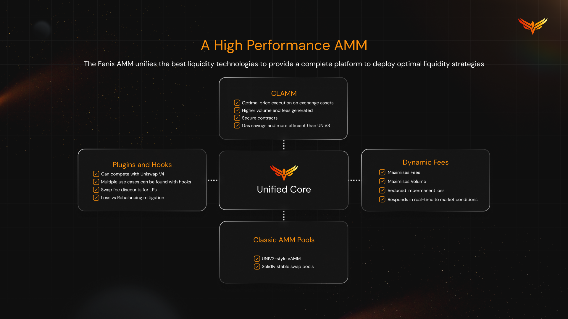 Fenix will deploy an advanced modular AMM architecture that is a real step forward in functionality for liquidity pool deployment, capital efficiency, price execution and fee generation on exchange assets.&#x20;