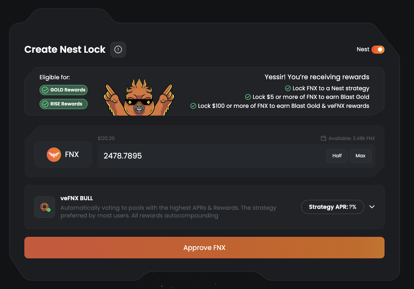 Tips: The "veFNX BULL" strategy automatically splits your votes across different pools to generate maximum rewards and it then compounds all rewards into veFNX to grow your governance power.