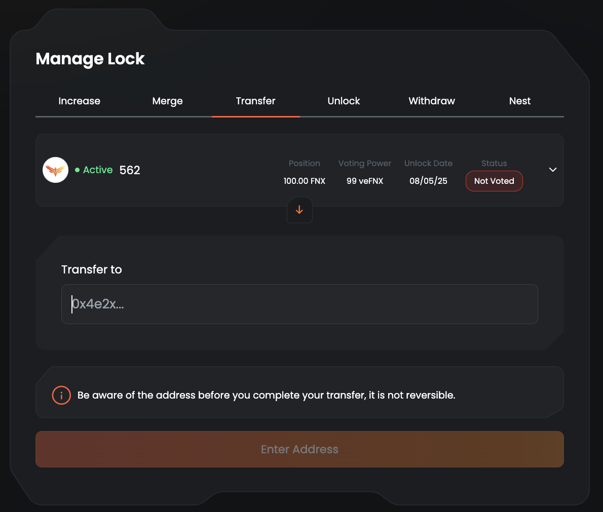 1. **Select your lock:** Choose which veFNX NFT you would like to send.&#x20;